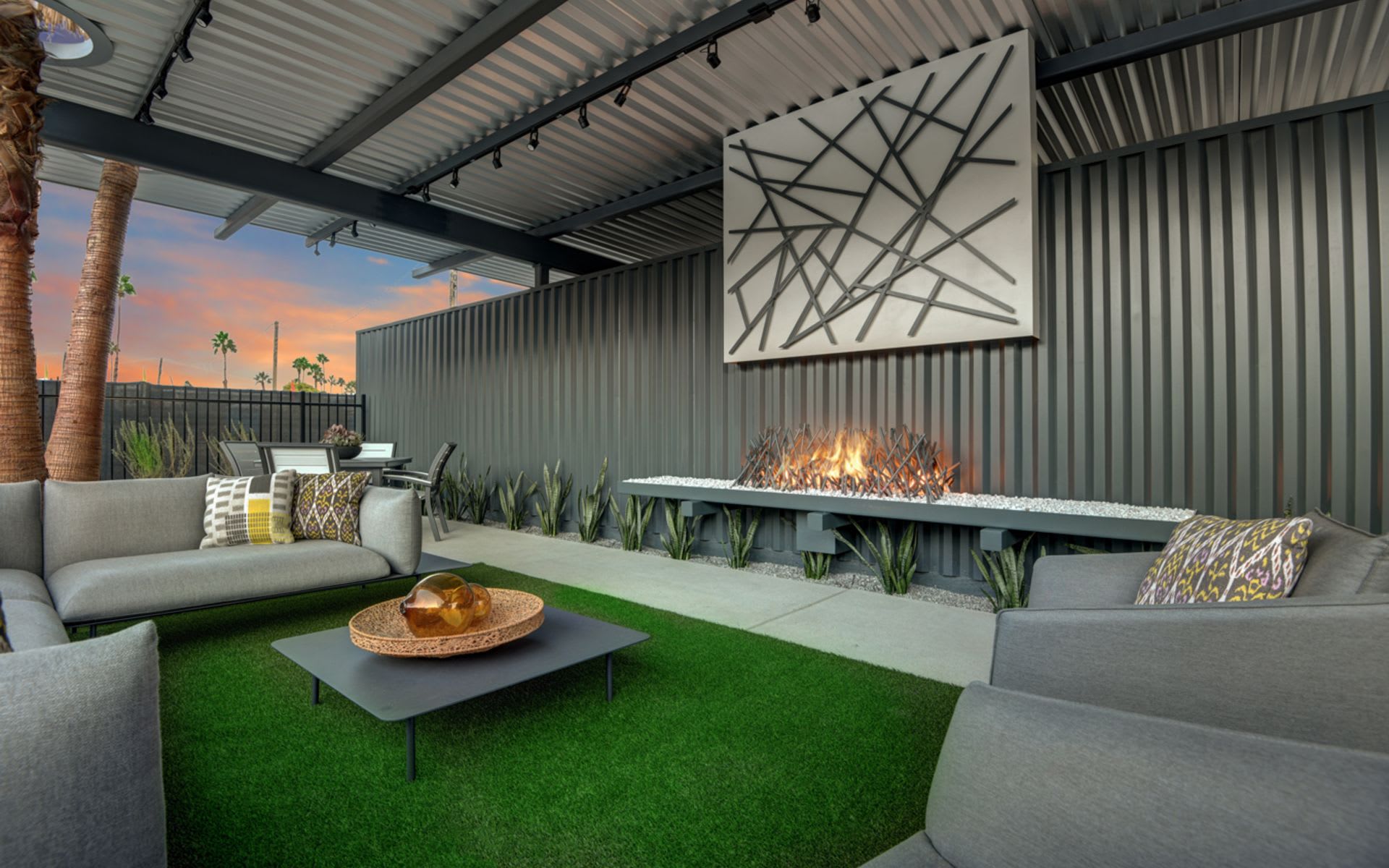 The exterior elevations showcase modern elements with a nod to mid-century designers featured throughout the community. Some of the eye-catching details included are clerestory windows, intricate woven iron gates and cantilevered shade structures and carport cover. The Riv pool architecture was inspired by, and is an homage to, the Mies van der Rohe Barcelona Pavilion. It features a 50’lap pool and spa along with an outdoor fireplace inspired by designer Phillipe Starck.