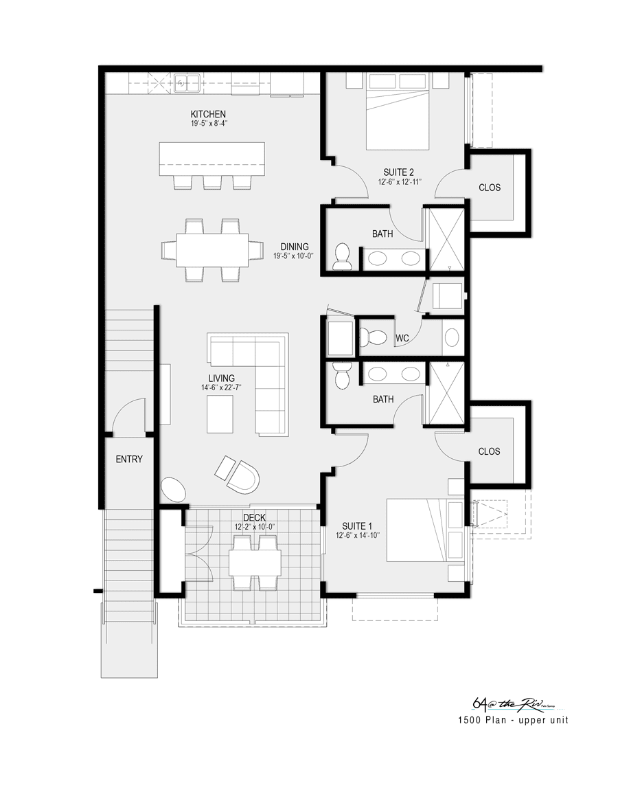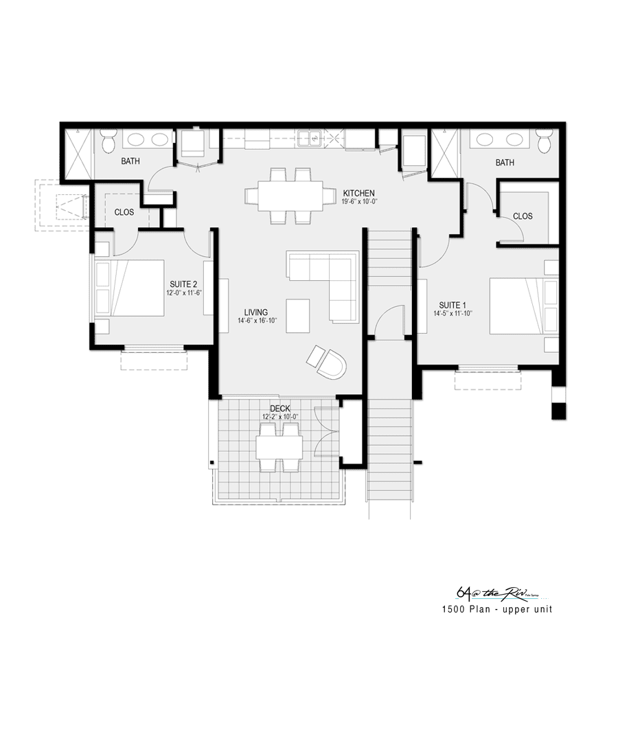 The 1500 series floor plan features 1,501 square feet of living space including loft-like living/dining/social kitchen common space.