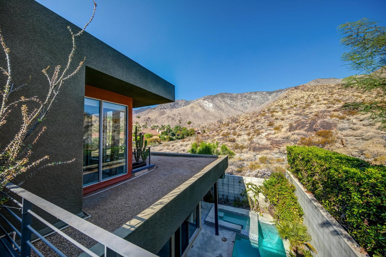 Views views views. Located in the exclusive South Palm Canyon area between Andreas Hills and Indian Canyons, between the base of the South Lykken trailhead and Moorten Botanical Gardens. Glorious views from every room into the canyons of South Palm Springs. Nothing but boulders and open land sit between you and the mountain. This sophisticated, condominium features 2 bedrooms plus bonus room, 2 1/2 baths, private pool and space. Roof decks off both bedrooms. Recent updates include gorgeous 24'' x 48'' concrete finish tiles throughout, with 100% natural wool berber carpet in bedrooms. The finishes are organic modern, with a Zen sophistication. The outdoor area is lushly planted with succulents and desert flora. 9' ceilings and 8' doors throughout. Two-car garage with epoxy finished floor. This shows like new construction.