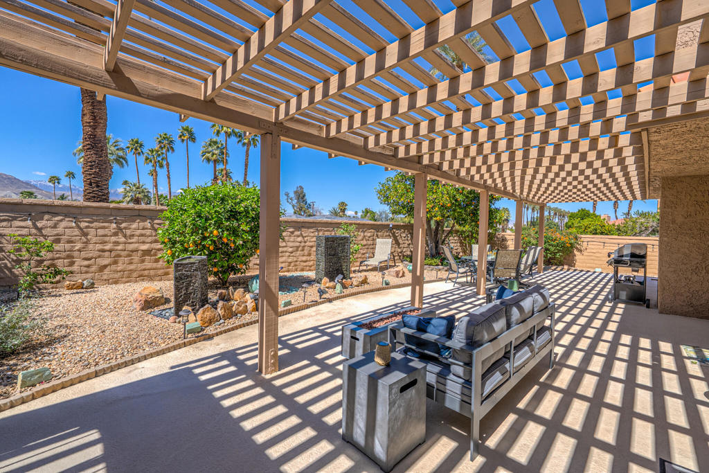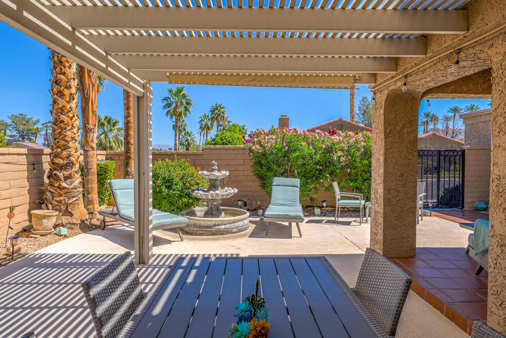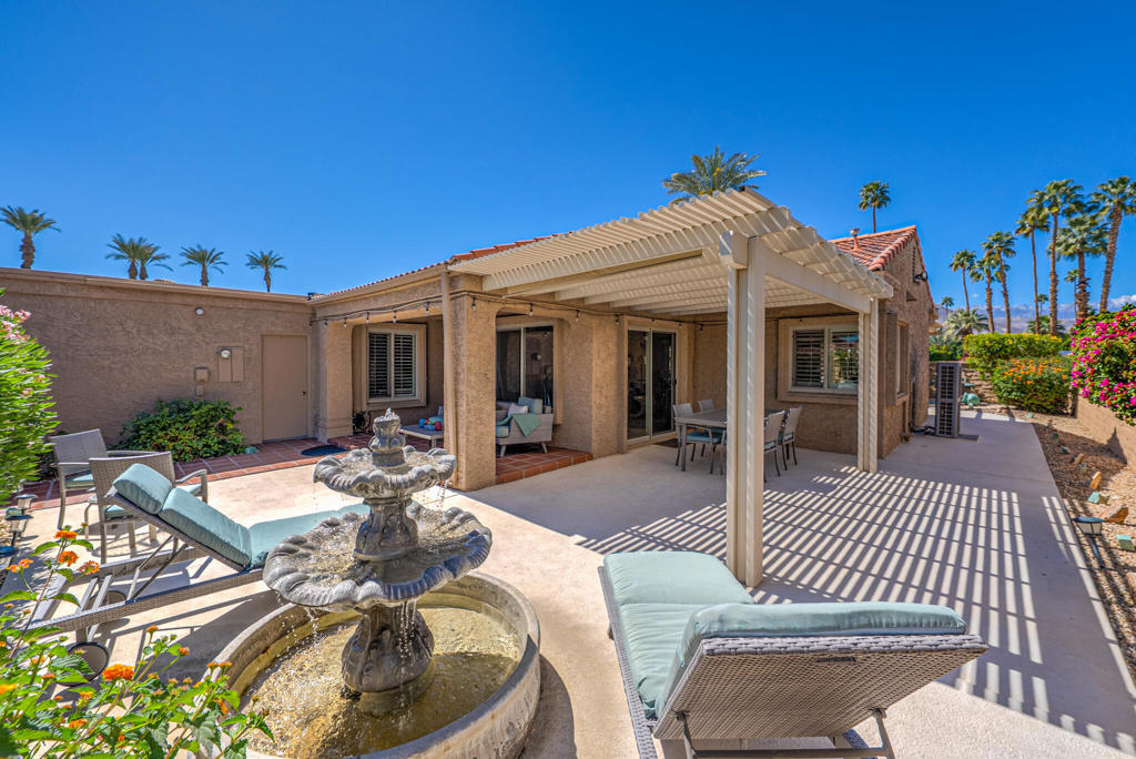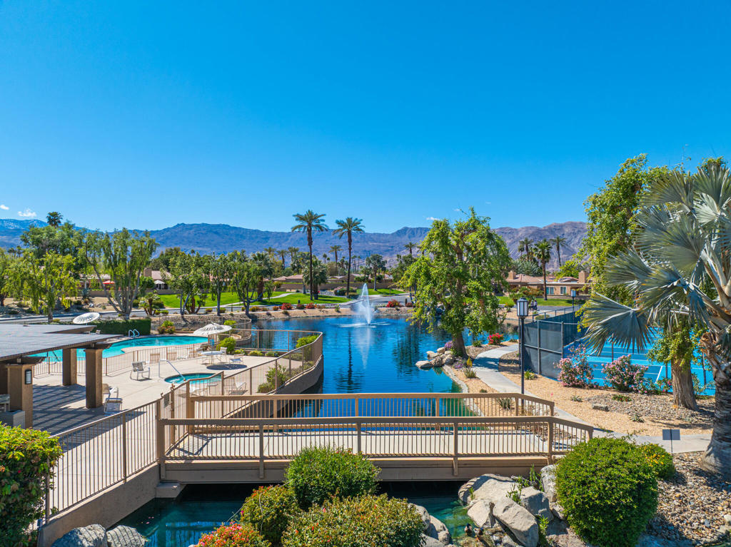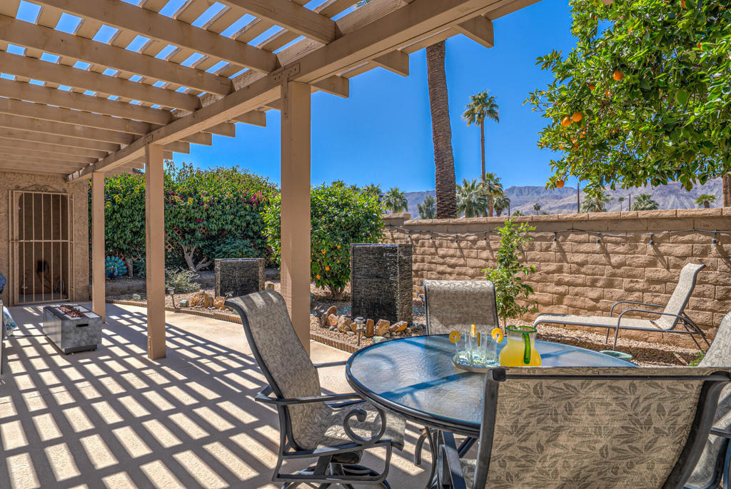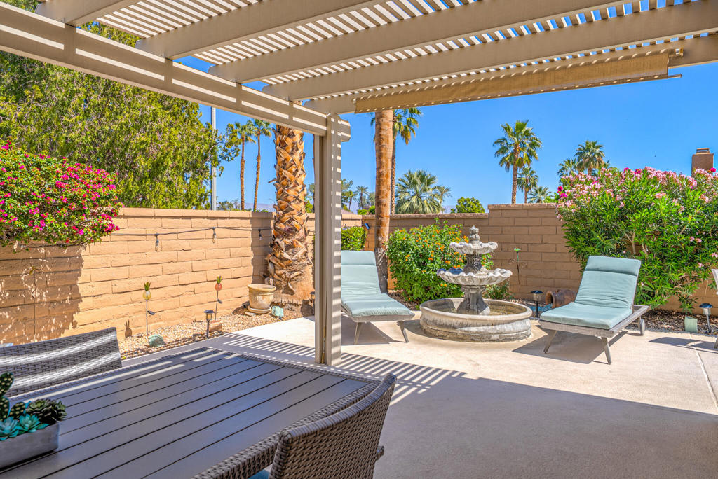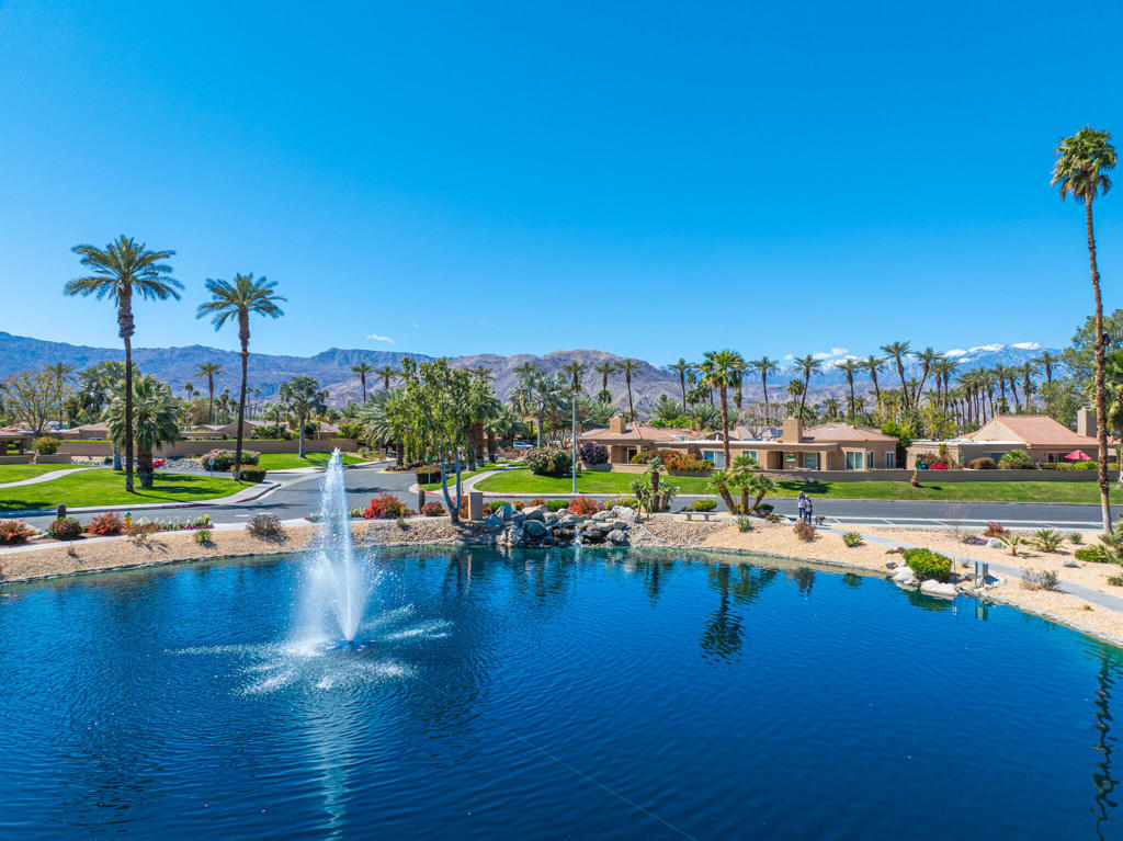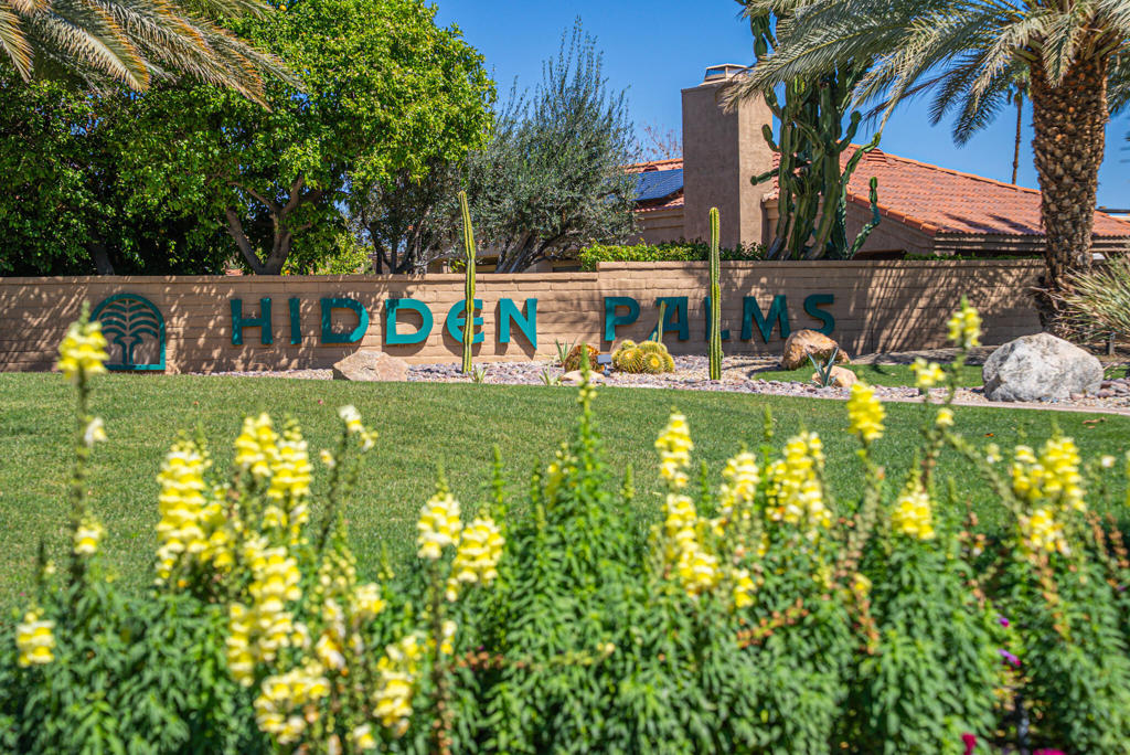 Beautifully renovated open plan kitchen and primary bath, exuding contemporary elegance! One of the largest lots in the charming community of Hidden Palms, with wraparound block walls for privacy and large east- and west-facing patios! Unobstructed mountain views! Updated landscaping, new water features, and your very own mature lemon and orange trees! This charming condo lives like a single family home. In addition to the kitchen and bath updates (2022/2023), the seller added new AC & air purifier, fresh paint (inside and out), wine fridge, blinds, and a water softening system. With 3-bedrooms, 2-baths this home spans 1,543 square feet and is bathed in natural light. It also includes a two car enclosed garage. Residents of Hidden Palms benefit from an array of amenities including tennis and pickleball courts, pools & spas, and a pristine lake with fountains and walking paths. as well as a security gate for added peace of mind. Located just minutes from the vibrant shops on El Paseo and tons of award-winning dining. Call to schedule your private showing.