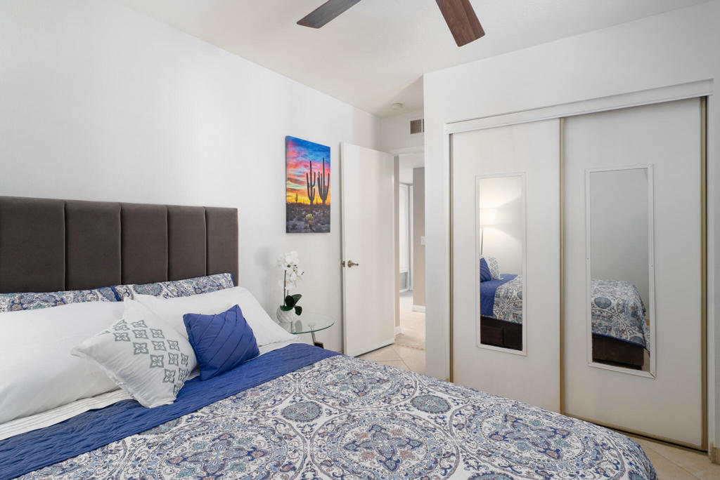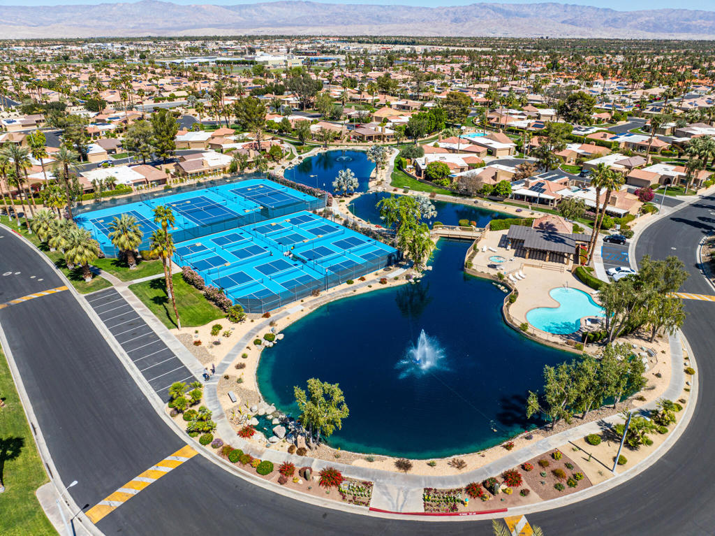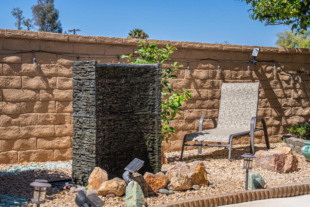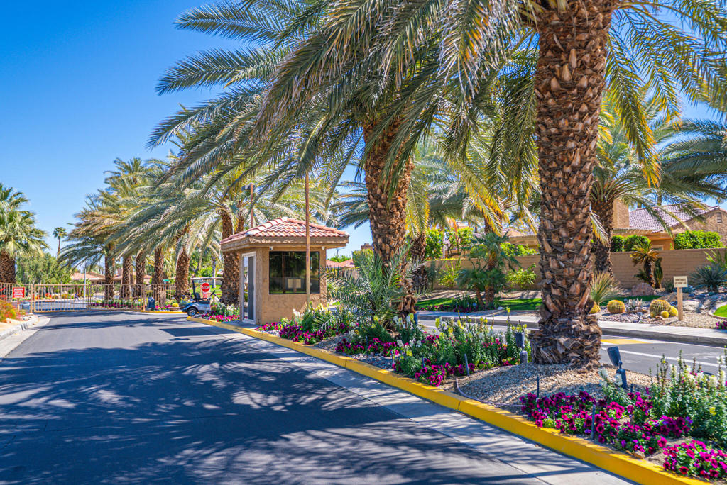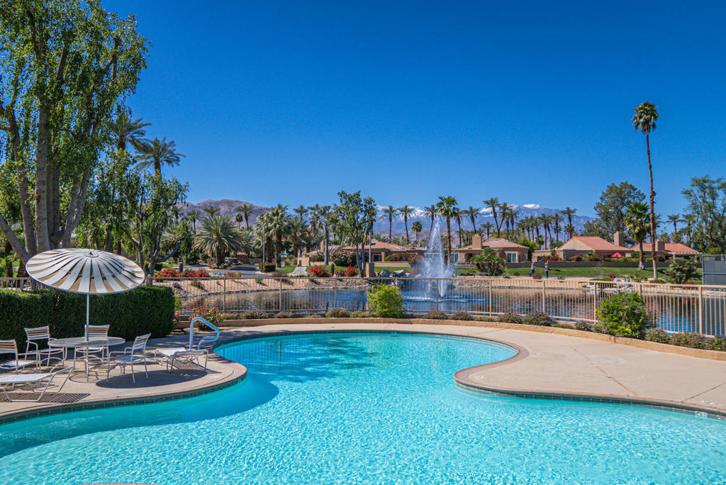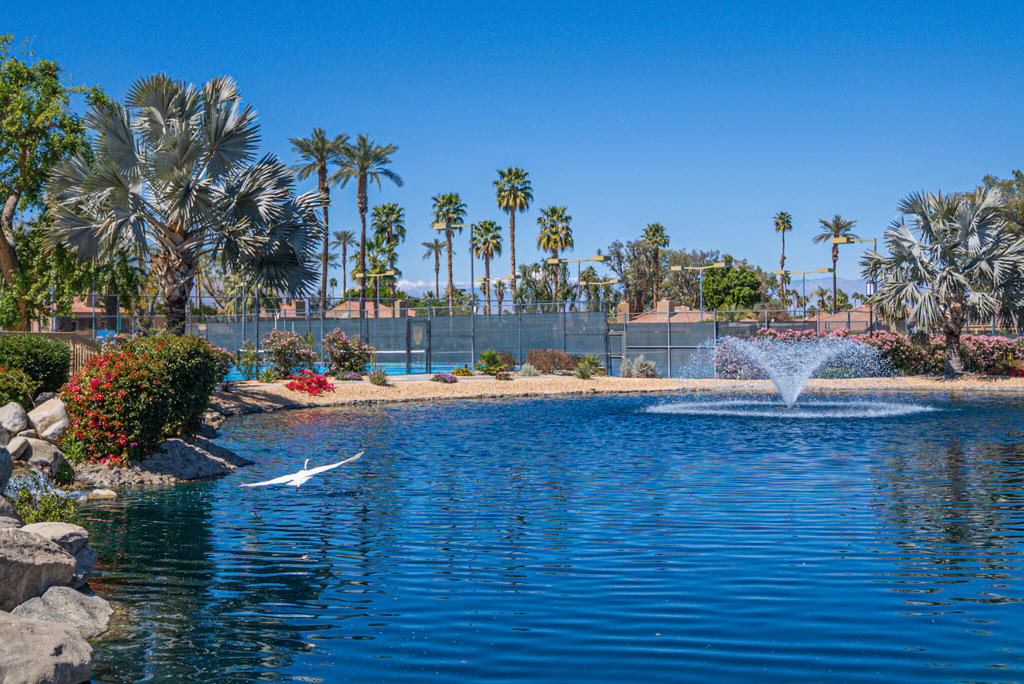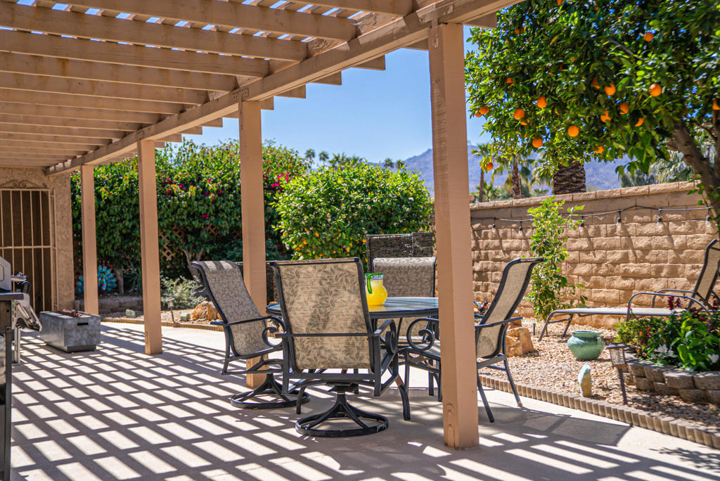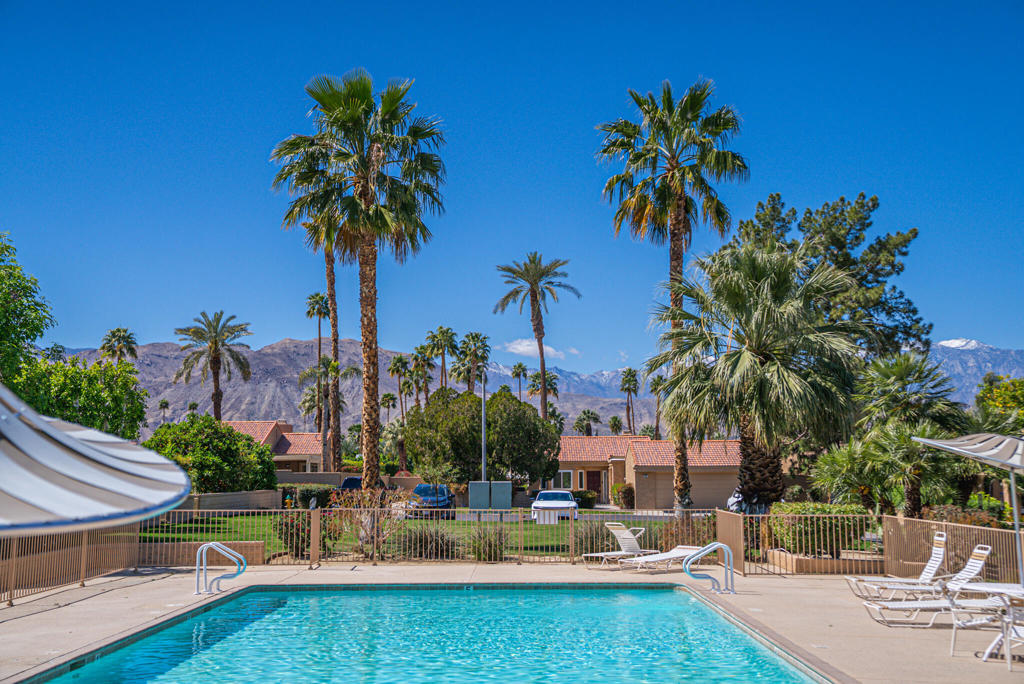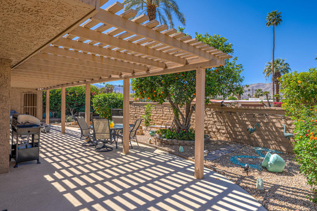 Beautifully renovated open plan kitchen and primary bath, exuding contemporary elegance! One of the largest lots in the charming community of Hidden Palms, with wraparound block walls for privacy and large east- and west-facing patios! Unobstructed mountain views! Updated landscaping, new water features, and your very own mature lemon and orange trees! This charming condo lives like a single family home. In addition to the kitchen and bath updates (2022/2023), the seller added new AC & air purifier, fresh paint (inside and out), wine fridge, blinds, and a water softening system. With 3-bedrooms, 2-baths this home spans 1,543 square feet and is bathed in natural light. It also includes a two car enclosed garage. Residents of Hidden Palms benefit from an array of amenities including tennis and pickleball courts, pools & spas, and a pristine lake with fountains and walking paths. as well as a security gate for added peace of mind. Located just minutes from the vibrant shops on El Paseo and tons of award-winning dining. Call to schedule your private showing.
